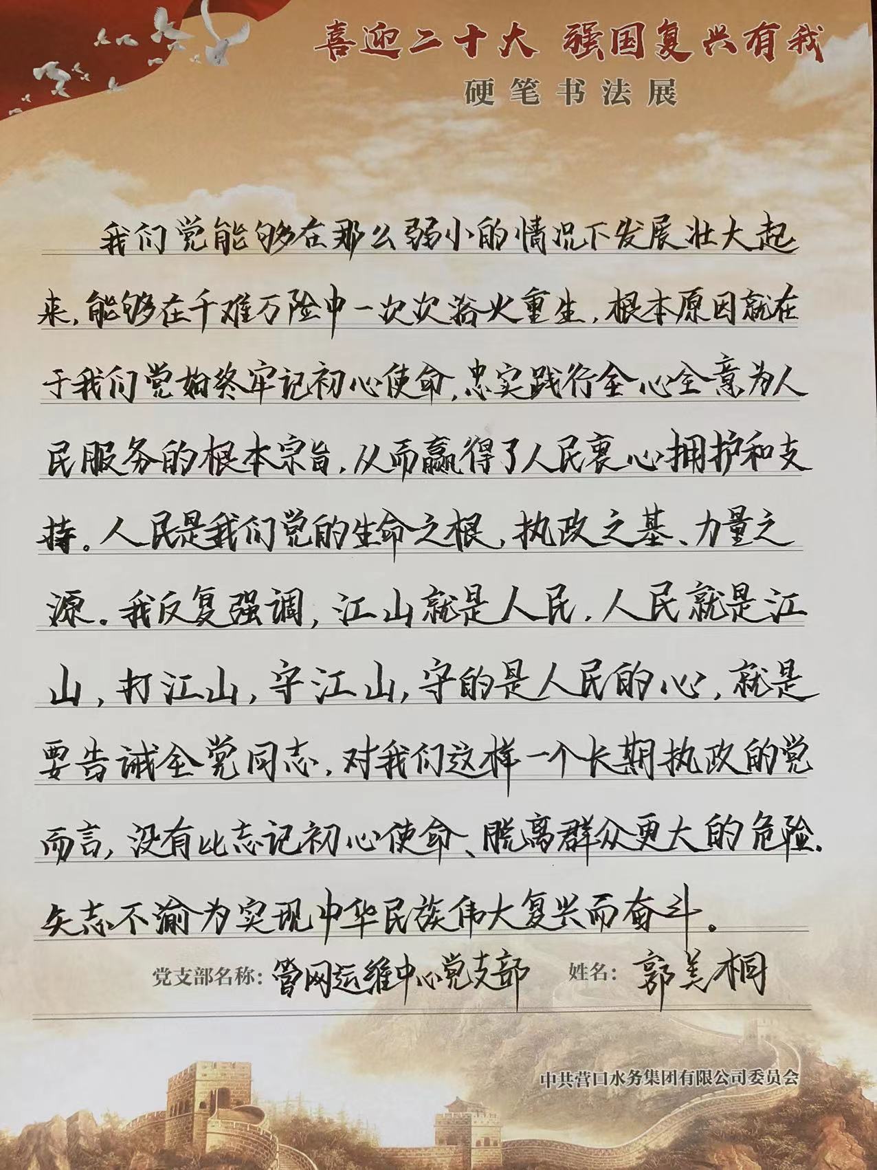 為深入學(xué)習(xí)貫徹習(xí)近平新時(shí)代中國(guó)特色社會(huì)主義思想,結(jié)合“強(qiáng)國(guó)復(fù)興有我”群眾性主題宣傳活動(dòng),水務(wù)集團(tuán)組織開(kāi)展“喜迎二十大 強(qiáng)國(guó)復(fù)興有我”硬筆書法展。
